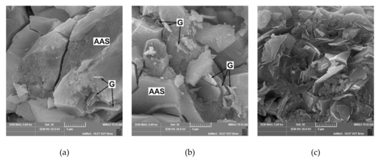 Microstructure of AAS composites with graphite filler—(a) 5 wt% graphite; (b) 10 wt% graphite; (c) 30 wt% graphite (G—graphite particles).