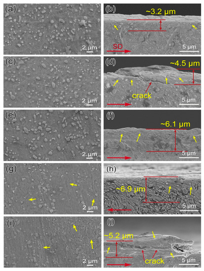 3.3. Morphologies of Worn Surfaces and Cross-Section
