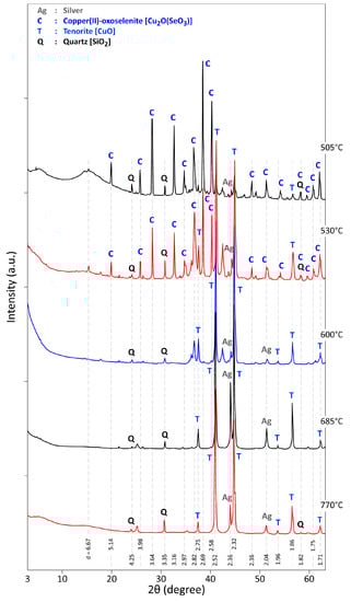 - Fokina, E.L.; Klimova, E.V.; Charykova, M.V.; Krivovichev, V.G.; Platonova, N.V.; Semenova, V.V.; Depmeier, W. The thermodynamics of arsenates, selenites, and sulfates in the oxidation zone of sulfide ores: VIII. Field of thermal stability of synthetic analog of chalcomenite, its dehydration and dissociation. Geol. Ore Deposits 2014, 56, 538–545. [Google Scholar] [CrossRef]
