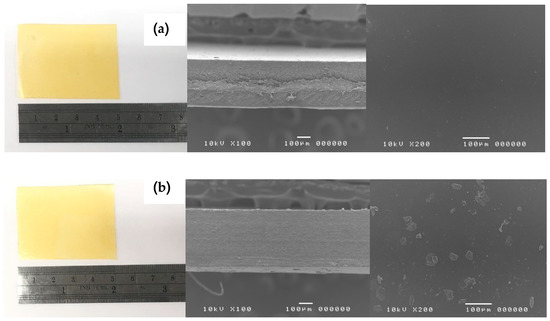 The gross appearance (left) and scanning electron images of cross-section at 100× (middle) and surface at 200× (right) of F-Glu (a) and F-Glu-Ca-G30 (b) hydrogel films.