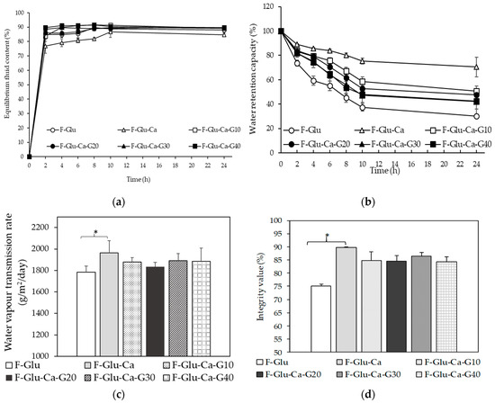 Fluid uptake ability (a), water retention capacity (b), water vapor transmission rate (c), and integrity value (d) of hydrogel films. * p-value < 0.05.