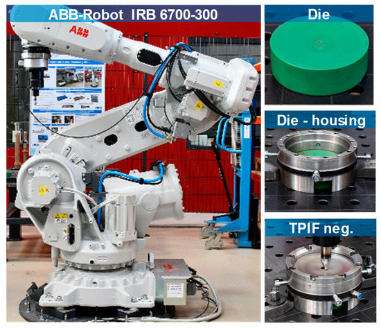 The experimental set-up of the TPIF process with a negative die is presented in Figure 2. The forming of the sheet blanks of steel A and steel B into incrementally formed disc springs is carried out using an ABB industrial robot and a hemispherical forming tool. Modular tooling with exchangeable Sika® block inserts is used as a negative die. The Sika® die force fits into a steel housing. The sheet blank is then clamped between a steel ring and housing containing the die. The clamped sheet blank is formed into the disc spring by the plastic deformation induced by the hemispherical tool. Furthermore, the die, housing, and the steel ring are manufactured for each spring geometry. The disc springs from steel A and steel B are then manufactured under the variation of tool diameter (5, 7.5, 10 mm) and tool step-down (0.05, 0.1, 0.2 mm). The central hole is trimmed after incremental forming to obtain the final shape of the disc springs.