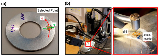 (a) Selected point for the measurement of the residual stresses, and (b) experimental set-up of the hole drilling method.