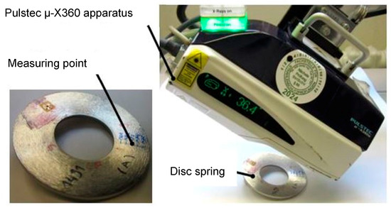 X-ray diffraction (XRD) Method. This method is a non-destructive residual stress measurement technique that is based on the measurement of the respective distance between the crystallographic planes. The spacing between the crystallographic planes is used as a measure of strain. The magnitude of the residual stress is measured by the comparison of the lattice plane spacing between the stressed and stress-free state of the material. The magnitudes of the residual stresses in disc springs manufactured from steel A with a dimension of 80/36/1 mm and steel B with a dimension of 112/57/1 mm were measured by using this technique. For this purpose, a portable X-ray residual stress analyzer μ-X360 from Pulstec industrial Co., Ltd. (Hamamatsu, Japan) was used. The stress analyzer is also capable of measuring the amount of the retained austenite in the MASS. The stress analyzer system uses Cr Kα-radiation and cosα-method for the residual stress measurements. An X-ray incidence angle of ψ0 = 30° was chosen. For the retained austenite content, an incidence angle of ψ0 = 18° was used. The experimental set-up is presented in Figure 4.