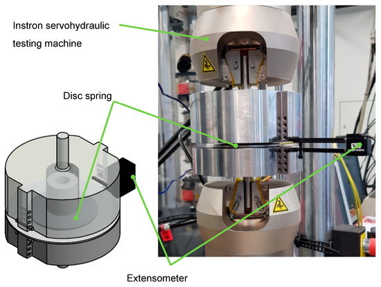 The mechanical tests were carried out using a servo-hydraulic testing system (F = ±10 kN). To achieve clamping of the disc spring with appropriate boundary conditions, a fixture was manufactured and attached to the testing system. The experimental set-up is presented in Figure 5. The quasi-static tests on the conventional and incrementally formed disc springs under varying process parameters were performed by compressing the disc springs to a flat position and measuring the respective force-deflection curves. For this purpose, an extensometer with a gauge length of 12.5 mm and a strain rate of 0.0025 s−1 were used. In this way, the respective comparison of characteristic force-displacement curves of the conventional and incrementally formed disc springs as well as the influence of process parameters on the characteristic force-displacement curves were determined.