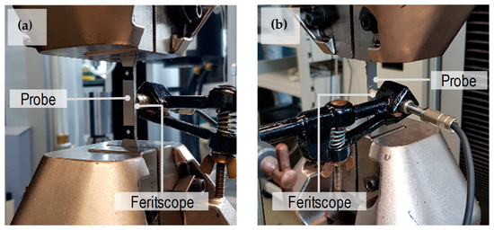 For material characterization, tensile test with in-situ ferromagnetic measurement was conducted for steel A to determine the evolution of the martensite volume fraction as a function of the plastic strains. The samples were taken from sheet blanks of steel A with a thickness of 3 mm and tensile tests were carried out by the universal testing machine Shimadzu AG-X (Kyoto, Japan) rated at 1200 kN. The ferromagnetic content was measured online with a Fisher Feritscope FMP-30. The martensite content was obtained from the ferromagnetic content by using the formulation proposed by Talonen et al. [27]. The experimental set-up is presented in Figure 6.