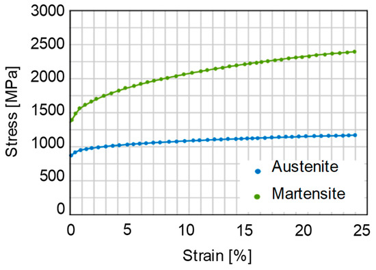 where are the equivalent von Mises stress, deviatoric stress, initial yield stress and isotropic hardening parameter respectively. A Young’s modulus of 188 MPa for austenite and 217 MPa for the martensite is assumed [30]. According to Equation (7), an important input required for the material model is the flow stress of the austenite and martensite phase. An analytical approach proposed by Bouqerel et al. [31] is utilized in the current study to determine the flow stress of each phase. The flow stress of the martensite phase can be calculated as: