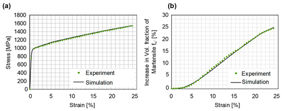 The three parameters (α, β, n) describing the evolution of the martensite content as a function of plastic strains were determined by using the experimental tensile test, feritscope data (Section 2.5) and an optimization procedure referred to as the inverse FE-approach. The inverse FE-approach is based on systematically varying the material parameters in the simulations until a good match is found between the numerical and the target experimental curves. The martensite transformation kinetics and the constitutive law is implemented as a vectorized user subroutine in the LS-Dyna® software. For optimization, simulations are carried out on a single 8-node cubic element with full integration scheme. This helps to achieve the material parameters with a minimal computational cost. The optimized curves for the stress-strain response and martensite evolution are presented in Figure 8. A good match is found between both curves. The optimized values of the material parameters achieved for these curves are 4.25, 0.807 and 1.98 for α, β and n respectively.