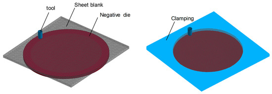 The implemented material model as a user subroutine along with the identified material parameters was used to perform the numerical simulations of the disc spring manufacturing. The numerical model was so set-up that it replicates the experimental conditions. A rigid die is modeled to have a TPIF with a negative die set-up. The hemispherical tool is modeled as a rigid body. The volume elements are used for the numerical simulations. The sheet blank was modelled as a 110 × 110 mm plate. Modeling the sheet as a square plate helps obtain a uniform meshing size. For meshing, a 3D 8-node element with an edge size of 0.6 mm was used. The clamping of the sheet blank was set-up in such a way that it replicates the experimental conditions. Furthermore, an explicit time integration with a time step of 1e-06 s was used. The experimental tool path trajectories were converted into respective velocity curves and used as input for the tool motion in the numerical model [33]. The set-up of the numerical model is presented in Figure 9.