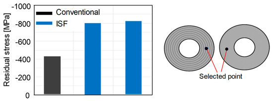 Furthermore, the residual stresses were measured using XRD technique in the conventional and incrementally formed disc springs from steel B and dimension 112/57/1 mm. The aim of these measurements was to check the repeatability of the residual stresses under a given set of process parameters. In this regard, the measurements were conducted on the center of the bottom face for a conventional disc spring and two incrementally formed disc springs manufactured under the same set of process parameters. The results are presented in Figure 11. It can be concluded that the residual stresses generated by the ISF process are repeatable under the same set of process parameters. Furthermore, similar to steel A, the magnitude of the compressive residual stresses on the bottom face is higher for incrementally formed disc springs for steel B in comparison to conventional disc springs.
