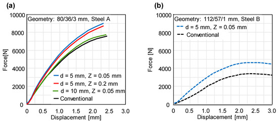 Using the experimental set-up, the quasi-static disc compression tests are performed for conventional and incrementally formed disc springs under the variation of the process parameters. The characteristic force-deflection curves for steel A and B are presented in Figure 12. A significant increase in the spring force as compared to the conventional disc springs is achieved for both materials. Based on the results of residual stress measurement (Figure 10) and force-deflection curves (Figure 12), it can be stated that the higher the magnitude of the near-surface compressive residual stresses is, the higher the spring force. The highest increase in the spring force is obtained for the smallest tool diameter, which in turn has the highest near-surface compressive residual stresses. Although the magnitude of the residual stresses is the same for different tool step-downs, the smallest tool step-down has the highest spring force.