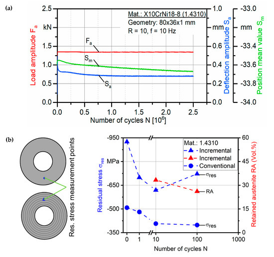 (a) Fatigue life investigation with a constant load amplitude for an incrementally formed disc spring of steel A. (b) Stability of the residual stresses in the first 100 loading cycles for steel A.