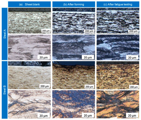 Micro-graphs of steel A and steel B cross-sections: (a) Sheet blank, (b) after forming, (c) after fatigue testing.