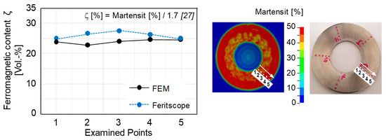 To analyze the spring properties from numerical simulations, the first step was to validate the numerical model. In this regard, the ferromagnetic content was measured at five distinct points located on the bottom surface of the disc springs by Feritscope measurements. These points are presented in Figure 15. Similarly, the martensite content at the same locations in the numerical simulation is converted into ferromagnetic content by using a calibration factor of 1.7, as proposed in the literature [27]. The calibration factor is necessary when converting ferromagnetic content into martensite. This is to minimize the measurement error of the Feritscope introduced due to magnetic permeability and also because it is a function of strain. Furthermore, the process parameters were the same for experiments and numerical simulations. The respective comparison shows that the measured experimental and numerical values correlate well. Hence, the model can be efficiently utilized to model the TRIP effect in MASS and to study the spring properties.