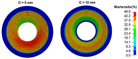 The spring force increases using a smaller tool diameter and tool step-down. Differences in the spring forces are due to the fact that the individual stress-strain response of each phase is separately considered in the user subroutine. Hence, each process parameter will create a different distribution of martensite and hence different spring properties. A comparison of the martensite content created by different tool diameters on the bottom face of the disc springs is presented in Figure 17.