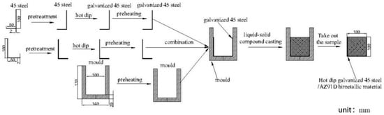 In the process of hot-dip galvanizing, the 45 steel was dipped into the pure molten zinc at 500 °C for 120 s. Before hot-dip galvanizing, 45 steel was immersed into the mixed solution of 20% ammonium chloride solution and 20% zinc chloride solution at 80 °C for 10 min, then dried instantly at 120 °C. After that, the galvanized 45 steel, bare 45 steel and the mold were preheated at 200 °C for one hour. At the same time, AZ91D was placed into the graphite crucible in an electrical resistance furnace at the elevated temperature to the 720 °C which was kept for 5 min under the protection of RJ2 covering flux. Finally, the melted AZ91D was casted into the mold inserted the bare or the galvanized steel, respectively. Figure 1 showed schematic diagram of outer cladding by solid-liquid compound casting. What is more, in order to improve the shear strength of AZ91D and 45 steel, the zinc coating was sandblasted by the sandblast mechanical. The grit applied in this experience is the alumina grit, the dimensions of which are 0.7–0.85 mm, while the working pressure was 0.7 MPa.