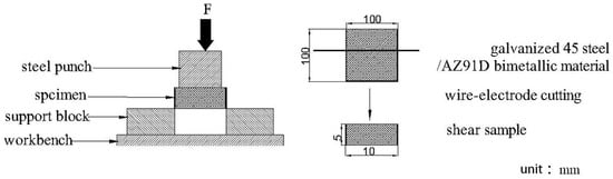 The shear strength of the interfaces in AZ91D/bare 45 steel and AZ91D/galvanized steel were tested to estimate the bond strength between AZ91D and 45 steel. And in order to achieve a more correct strength, three specimens were used for testing. The shear test equipment P4000A (Island ferry company, Kyoto, Japan) is shown in Figure 2, and the shear strength of the interface could be calculated based on the equation as follows: