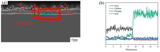 (a) SEM micrograph of interfacial microstructure of cross-section image of hot-dip galvanized 45 steel; (b) EDS line scan of cross-section of hot-dip galvanized 45 steel marked in (a).