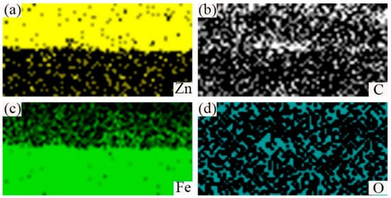 EDS maps scan of the cross-section image of hot-dip galvanized 45 steel marked in Figure 3a. (a)EDS map of Zn element; (b) EDS map of C element; (c) EDS map of Fe element; and (d) EDS map of O element.