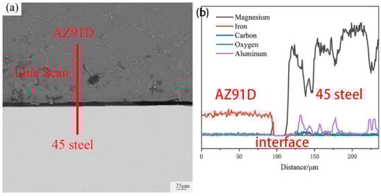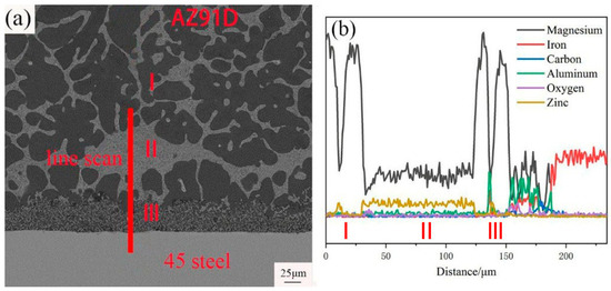 In order to explain the role of Zn coating, the cross-section image of AZ91D/bare-45 steel and the correspond EDS line scan morphology was displayed in Figure 10. It could be concluded that there is no reaction layer between AZ91D and bare 45 steel. Although there is no reaction layer, mechanical bonding still exists between AZ91D and 45 steel, and it was worth noting that the existence of Al element in the 45 steel can implies that under the influence of a liquid Mg alloy, Al element was diffused into 45 steel. However, the content of the Al element was negligible. In a conclusion, the Zn coating is beneficial to the formation of reaction layers and metallurgical bonding. In other words, Zn coating improves the surface wettability of the steel.
