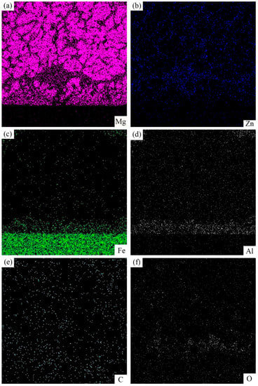 According to the energy dispersive spectrometer (EDS) line scan in Figure 6b, the Al element was enriched in the layer III while the content of Zn element in this layer is smaller than other layers. Furthermore, in the layer III, Al element prefers to react with the Fe element instead of the Mg element to form an FeAl3 intermediate compound which contained a few Zn atoms, and the block black phase was α-Mg, which contained a few Zn and Al atoms. In order to verify this statement, an EDS map scan was applied in Figure 9. The black blocky phase area contained an Mg element and a small amount of Zn and Al elements, while the small white block phase contained iron, Zn and Al elements without Mg element, which could further prove the result of EDS point scan. The O element was abundant in the layer close to 45 steel due to the oxidation of zinc and magnesium alloy, but the content of the O element was negligibly low.