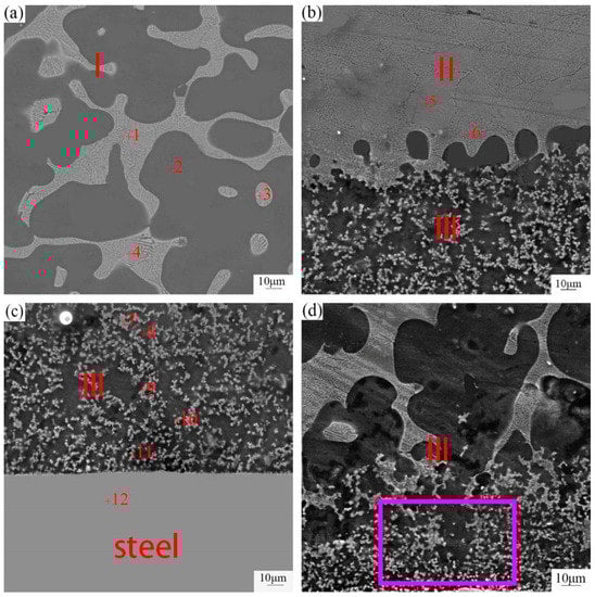 SEM image of the three different layers in galvanized-steel/AZ91D bimetallic material. (a) area of layer I in Figure 5a; (b) area of the interface between layer I and II in Figure 5a; (c) area of the interface between layer III and steel in Figure 5a; and (d) area of layer III in Figure 5a.