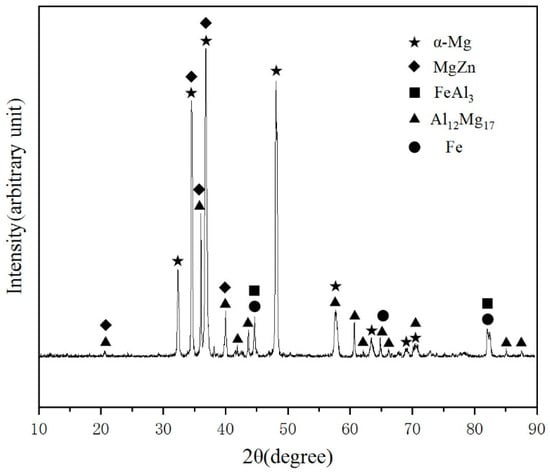 In order to accurately identify the phases, XRD detection was applied in the center of interface zone and the corresponding result was shown in Figure 8. It could prove the existence of α-Mg, MgZn, Al12Mg17, Fe and FeAl3 in the test area. According to the bind energy of and element content, there were not Al12Mg17 and Fe in the interface zone. So, it could be deduced that there are α-Mg, MgZn and FeAl3 in the interface zone.