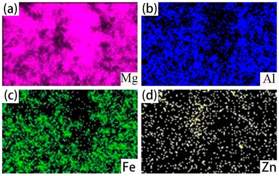 Corresponding EDS maps of the cross-section of the galvanized-steel/AZ91D bimetallic material marked in Figure 7d. (a) EDS map scan of Mg element; (b) EDS map scan of Al element; (c) EDS map scan of Fe element; and (d) EDS map scan of Zn element.