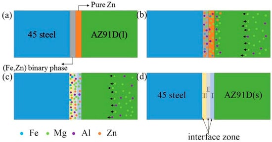 Based on the above analysis, the schematic of microstructure evolution in the galvanized-steel/AZ91D interface was showed in Figure 11 below and can be divided into four stages: (1) filling process of liquid metals; (2) diffusion process and chemical reactions; (3) metallurgical reaction among the Al, Fe, Mg, Zn elements; (4) solidification as shown in Figure 11. Firstly, AZ91D liquid metals filled the cavity instantly and when the liquid Mg alloy contacted with the Zn coating, the liquid Mg solidified instantly as shown in Figure 11a. At the second stage was diffusion process and chemical reactions as shown in Figure 11b. Under the heat of liquid Mg alloy, Zn coating reacted with solidified Mg alloy, forming different phases in different layers. During this process, the diffusion process and chemical reactions took place in the interfacial zone. According to the diffusion theory, a lot of Mg and Al diffused into Zn coating and a few Zn diffused into AZ91D substrate. What was more, on account of the thin Zn coating, the Mg and Al diffused adequately under the temperature gradient and concentration gradient. In addition, the content of Mg and Al elements in the layer I was close to the layer II. Because the diffusibility of Zn into Mg was smaller than Mg into Zn, a small quantity of Zn diffused into AZ91D. According to the fact that binding energy of Mg and Zn was smaller than Zn and Fe [16,17,18], when the concentration of the Mg atom exceeded the solid solution limit of Zn instantaneously, the eutectic structure and α-Mg were formed. With the increase of the diffusion distance, the diffusibility of Zn element gradually reduces and the content of Zn element gradually increases. So, when the concentration of the Mg element exceeded the solid solution limit of Zn element, the eutectic structure was generated. The third stage was full of metallurgical reactions among the Al, Fe, Mg, Zn elements (Figure 11c). The Al element reached layer III and reacted with Fe to form a FeAl3 phase, and a few Zn dissolved into FeAl3. With the formation of FeAl3, the concentration gradient of Al element increased and more Al diffused into layer III. At the same time, α-Mg was formed because of solution limits. Finally, the metallurgical interface which consisted of an (MgZn + α-Mg) eutectic structure, α-Mg and FeAl3 was generated between 45 steel and AZ91D after solidification (Figure 11d).