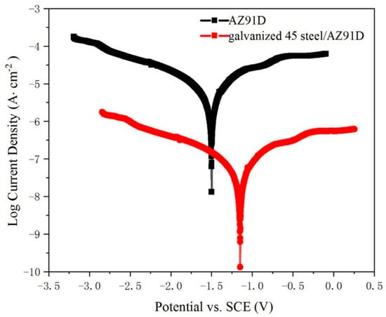 In order to evaluate the corrosion performance of galvanized-steel/AZ91D bimetallic material and AZ91D, the corrosion tests of these specimens were carried out in 3.5 wt.% NaCl solution at 25 °C. Polarization curves of the galvanized-steel/AZ91D bimetallic materials and AZ91D are shown in Figure 12, the coordinate x-axis represents the corrosion potential relative to the saturated calomel electrode (SCE) and the y-axis represents the logarithm of corrosion current density. Compared with AZ91D, galvanized-steel /AZ91D bimetallic material had better corrosion resistance. The corrosion potential of AZ91D was −1.493V, while the corrosion potential of galvanized steel/AZ91D bimetallic material was −1.143V. In addition, the corrosion current density of AZ91D and galvanized-steel /AZ91D bimetallic material were 3.015 × 10−5 A/cm2 and 1.34 × 10−7 A/cm2, respectively. These phenomenon indicated that the zinc coating on the surface could effectively improve the corrosion resistance of the galvanized-steel/AZ91D bimetallic material. Actually, hot-dip galvanizing coating on the surface could work as the protective layer due to electric potential difference between 45 steel and Zn. The battery was composed of two kinds of coating layers (hot-dip galvanizing coating and 45 steel substrate). Because hot-dip galvanizing layer has a lower electric potential than 45 steel substrate, hot-dip galvanized coating is oxidized as the anode, while 45 steel substrate is protected as the cathode. Because of the pyknotic ZnO film, the rate of corrosion was slow.