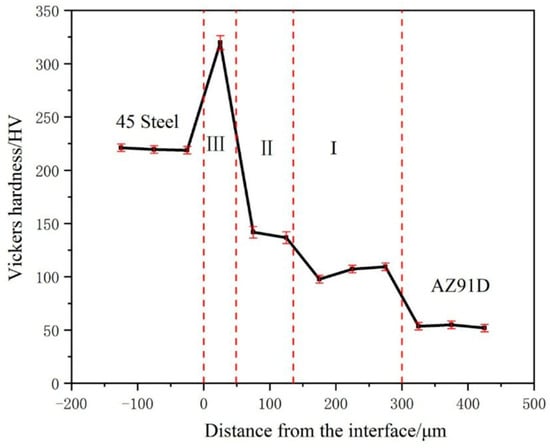 The microhardness distributions from galvanized 45 steel to AZ91D along the vertical direction of the interface were measured by an Everone MH-3L microhardness tester (Everone, Singapore). Moreover, in order to accurately measure the microhardness, suitable testing load and holding time were used. A testing load of 50 N for a holding time (15 s) were applied in AZ91D substrate and 45 steel.