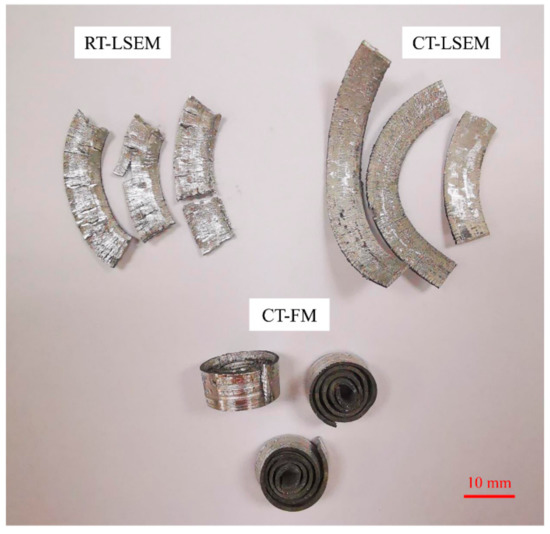 Chips and their morphologies of RT-LSEM, CT-LSEM, and CT-FM at a machining velocity of Vc = 5.4 m/min.