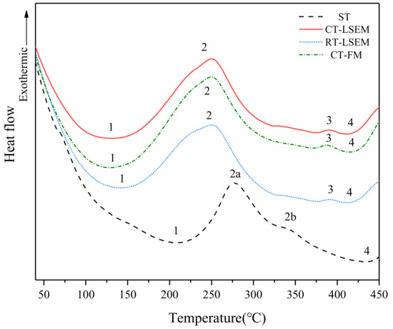 DSC thermograms of ST, RT-LSEM, CT-LSEM and CT-FM samples are shown in Figure 5. Based on the precipitation sequence, the DSC curves can be analyzed as follows. The trends are quite similar for all DSC curves. A large endothermic peak (label 1) appearing in all samples are probably corresponding to either dissolution of GP zones or metastable η’ (MgZn2) phases. However, no reactions corresponding to the formation of GP zones can be detected in all samples. It is reported that GP zones are formed at low temperatures ranging from 20 °C–125 °C [19]. Therefore, it can be deduced that GP zones are expected to be formed prior to the DSC run. Also, peak 1 in the LSEM and CT-FM samples occurs much earlier than that in the ST sample, indicating that the transition temperature from GP zones to η’ phases is lower for the deformed materials. On the other hand, a large exothermic peak (label 2) including a shoulder on the left can be observed in the three deformed samples, which is probably a mix of metastable η’ and equilibrium η phase formation reactions. For the ST sample, the formation of η’ and η precipitates are separate and they are marked by label 2a and 2b respectively. The large exothermic peak can be mainly attributed to the release of stored energy during the recovery of the deformed alloys [20]. Based on the above mentioned analysis, it can be concluded that the alloys subjected to LSEM and FM have a lot of room for improvement in strength once they are annealed with proper temperatures. This is because plenty of strengthening phases such as η’ and η would precipitate out from the matrix, resulting a large enhancement of strength of the materials. Therefore, the combination of CT-LSEM and subsequent aging treatment will be a focus of the forthcoming works.