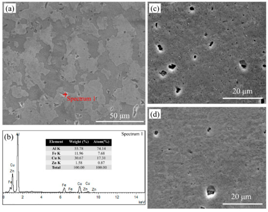SEM micrographs of (a) the ST Al 7075 alloy; (c) the CT-LSEM sample; and (d) the RT-LSEM sample; (b) EDS results of the particle phase marked in Figure 7a.