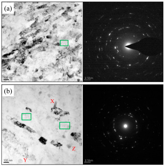 TEM microscopes and corresponding SAED patterns of Al 7075 subjected to (a) CT-LSEM and (b) RT-LSEM at a machining velocity of Vc = 5.4 m/min.