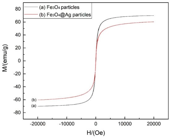 Hysteresis loops of Fe3O4 particles and Fe3O4@Ag particles measured by VSM at 300 K are shown in Figure 5. Saturation magnetization (Ms) of Fe3O4@Ag particles reduces slightly. They have no remnant magnetism properties that can be used in the sensors of magnetic field. The reduction in Ms results from the decrease in magnetic particle density. The energy of magnetic materials in an external magnetic field is proportional to the number of magnetic molecules in a single magnetic domain. This decrease reflects a smaller percentage of net magnetic material per gram of overall sample. The large surface-to-volume ratio of Fe3O4@Ag particles is possibly another factor that leads to the decrease in Ms.