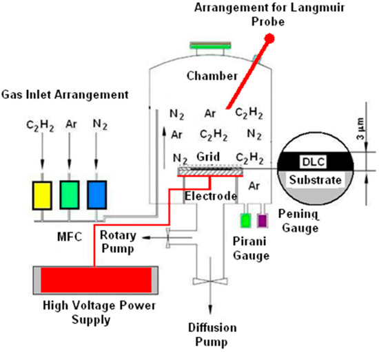 The diamond-like carbon (DLC) coating with a thickness of approximately 3 μm on the steel substrate was covered, by using the plasma-enhanced chemical vapor deposition (PECVD) method. The diagram of equipment for the production of DLC coating using the PECVD method, is shown in Figure 2 [3].