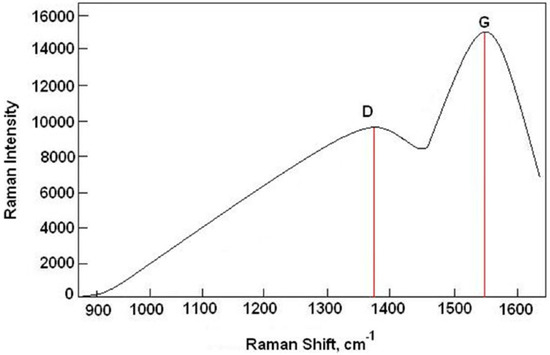 Raman spectrum for the diamond-like carbon coating applied to the surface of S355: D—diamond structure and G—graphite structure.