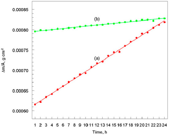 The surface of the substrate under hot air conditions (400 °C) was covered with a thick porous oxide layer, which did not create an effective obstacle in the access of the oxidant to the metal surface. Therefore, its mass significantly increased (over 30%), compared to the mass of the same specimen before the experiment (Figure 5a). However, no significant surface changes were observed for the S355/DLC. In this case, after the measurement, the mass of the test specimen changed slightly (about 3%; Figure 5b). In addition, the diamond-like carbon coating still adhered well to the surface of the substrate. It could be assumed that the DLC layer covering of the S355 surface did not significantly lose its anti-corrosive properties after being exposed to an atmosphere of hot air heated to 400 °C.