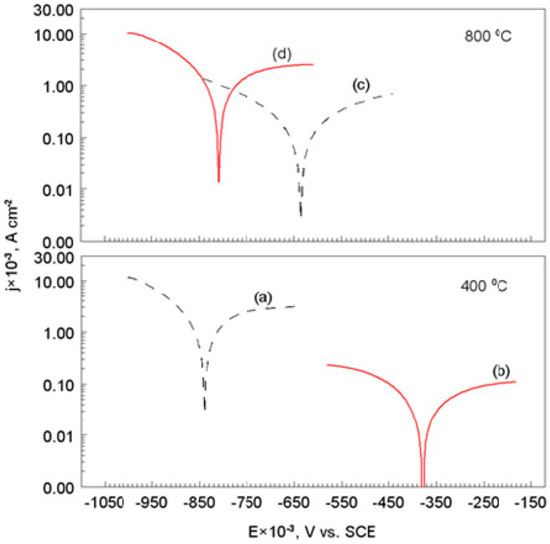 Figure 7a,c show the potentiodynamic polarization curves (semilogarithmic scale) for the S355 steel without, and with DLC coating, after the heat treatment in air atmosphere, respectively, at 400 and 800 °C.