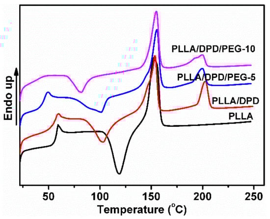 4.1. Thermal Behaviors of PLLA, PLLA/DPD, and PLLA/DPD/PEG Blends