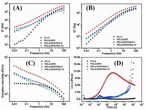 The frequency sweep experiments of PLLA/DPD blends were carried out at 170 °C to investigate the effects of DPD and PEG on the rheological behaviors of the PLLA matrix. Figure 2 shows the G′ (Figure 2A), G″ (Figure 2B), complex viscosity (Figure 2C), and continuous weighted relaxation spectrum (Figure 2D) of samples.