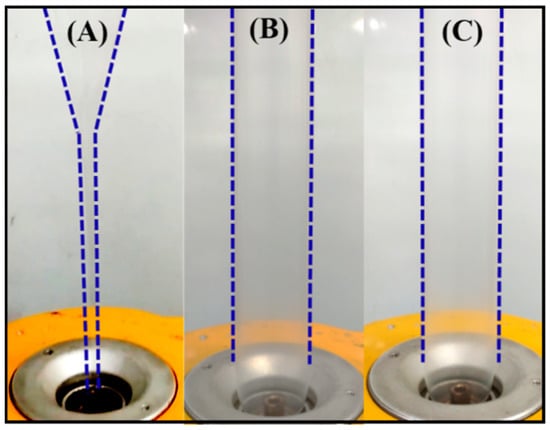The neat PLLA, PLLA/DPD, and PLLA/DPD/PEG-10 blends were chosen to conduct film blowing processing, and their blown bubble shapes were displayed in Figure 4 and Video S1. As shown in Figure 4A, PLLA’s low melt strength and quick relaxation character make it hard to meet the requirements of continuous film blowing process, and the unstable bubble burst, and bubble dancing appeared through the processing, which may disrupt the production and increase the production costs. With the appearance of melt enhancer special SC networks, the film blowing bubbles of PLLA/DPD (Figure 4B) and PLLA/DPD/PEG-10 (Figure 4C) are very stable, which can achieve continuous production of the film blowing process and lower the production costs of PLA film. The blow-up ratio can be maintained between 2.8–3.0, which is widely applied in industrial film blowing. The special SC structure (Figure S2) plays the main role in improving the melt stability of film blowing of PLLA, which helps achieve the continuous production of PLLA’s film blowing.