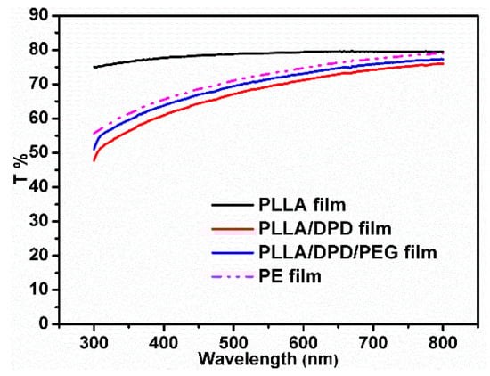 Light transmittance is very important in agricultural film production. It directly affects the growth of plants because the photosynthesis of plants mainly absorbs visible light at the wavelength of 400–700 nm [,]. Figure 5 and Table 2 show that the obtained PLLA/DPD and PLLLA/DPD/PEG-10 films hold less transparency compared with highly transparent PLLA films. However, PLLA/DPD/PEG-10 blown film is still highly transparent with a light transmittance property similar to PE, and its T% is 75.84% under 700 nm wavelengths of light. The PLLA/DPD/PEG-10 film can potentially be used as an agricultural film to ensure the solar transmittance through the film.
