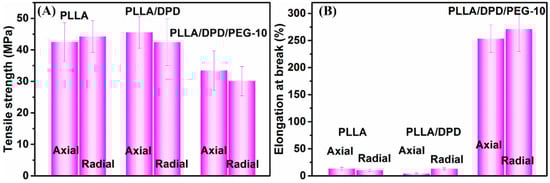PLA’s application as film materials is also greatly limited by its brittleness [,]. In this work, PEG was added mainly to improve the toughness of PLLA film. After the film blowing process, the radial and axial direction of PLLA, PLLA/DPD, and PLLA/DPD/PEG-10 blown films were tested and their results were listed in Figure 6 and Table 3. The results show that PLLA film is a rigid material with a good tensile strength and poor toughness, which shows elongation at break value about 13.13% and 10.26% in the radial and axial direction. The PLLA/DPD film shows little change compared with the PLLA film, while the tensile strength of the PLLA/DPD/PEG-10 film decreased by about 21.39% in the radial direction, and 32.20% in the axial direction compared with PLLA film. The elongation at break of the PLLA/DPD/PEG-10 film reaches over 250% in both directions, increases by 18.3 times in the radial direction, and 25.4 times in the axial direction compared with the PLLA film. It also shows a much higher effectiveness compared with the other reported PLA/PBAT and PLA/PBS blown films at even higher loading []. As shown in Figure 7, the PLLA film and PLLA/DPD film exhibit smooth brittle fracture surfaces, which indicate their brittleness, while the PLLA/DPD/PEG-10 film’s rough surface demonstrates an obvious ductile fracture, indicating that the material has a good toughness. The super-toughed PLLA/DPD/PEG-10 film can potentially be used as packaging and agricultural films.