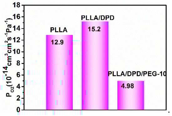 The gas barrier property is very important as a packaging material, which holds the key for protecting vulnerable to O2 degradation of perishable goods [,]. As shown in Figure 8, the O2 permeability (PO2) is 12.9 × 10−14 cm3 cm2 s−1 Pa−1 in the PLLA film, which shows a poor gas barrier property compared with other films. With the addition of DPD, the PLLA/DPD is stable in the film blown process, but its O2 barrier ability was also impacted slightly, and its PO2 increased by about 23% to 15.2 × 10−14 cm3 cm2 s−1 Pa−1. With the addition of 10 wt% PEG to PLLA/DPD, the PLLA/DPD/PEG-10 can not only withstand the film blowing process but also achieve a 61% reduction in PO2 to 4.98 × 10−14 cm3 cm2 s−1 Pa−1. The O2 does not always diffuse along the direction perpendicular to the film and it may change its original permeability path from a vertical to horizontal direction []. In this case, an increase in oxygen permeability can be observed after the introduction of PEG to PLLA/DPD. The reasons can be inferred in two ways. Firstly, flexible PEG can fill up the interfacial defects between DPD and PLLA, and gives rise to the increasing path tortuosity and the decreasing cross section for O2 permeability. Secondly, more homocrystallites of higher perfection and the less permeable amorphous phase formed in the PLLA/DPD/PEG-10 film may also cause an increase of gas permeability []. In this work, the remarkable improvement in O2 barrier properties of PLLA/DPD/PEG-10 film makes it a good candidate for packaging material.
