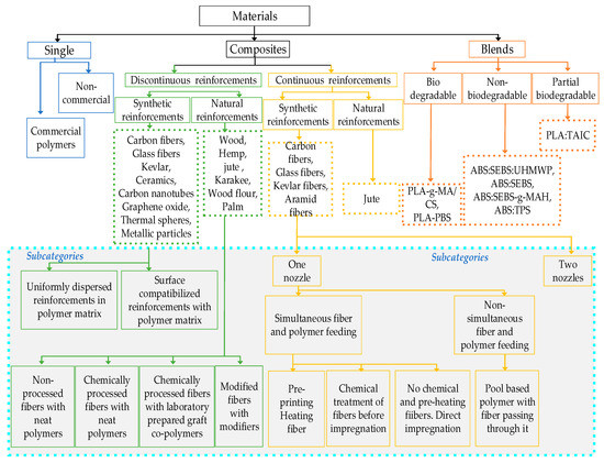 - The basic three types of materials, i.e., single, composites and blends, are analyzed in terms of modifications in process parameters, physical setups and environmental conditions. Furthermore, the above-mentioned three basic types are classified into the sub-categories to explain the modifications in materials that present their true capability.