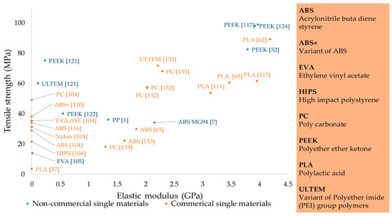 - Single materials are categorized into commercial and non-commercial. Commercial materials are researched more than non-commercial materials. However, non-commercial materials have shown more potential to reach high tensile strength. For example, injection molding grade PEEK has the highest strength of 110 MPa as compared to 89.1 MPa for commercial PLA. Most research on single materials has shown a lack of physical modification of the printing system or temperature control. The research mostly comprises process variables’ optimization. The combination of physical setup modification and ambient temperature still has research potential for Nylon and ULTEM. Furthermore, biodegradable materials such as polycaprolactone (PCL), are not properly investigated for tensile properties as the literature generally reports the compression and flexural properties of PCL in FFF based medical applications.