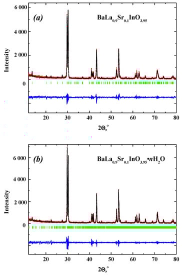| BaLa0.9Ba0.1InO3.95∙nH2O | 12.741(0) | 14.806(5) | 7.222(6) | 92.75(2) | 1360(9) |