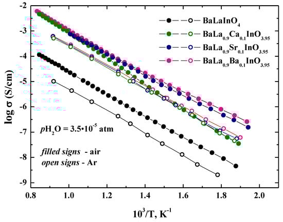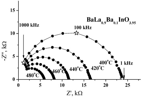 - Li, X.; Shimada, H.; Ihara, M. Conductivity of New Electrolyte Material Pr1−xM1+xInO4 (M = Ba, Sr) with Related Perovskite Structure for Solid Oxide Fuel Cells. ECS Trans. 2013, 50, 3–14. [Google Scholar] [CrossRef]